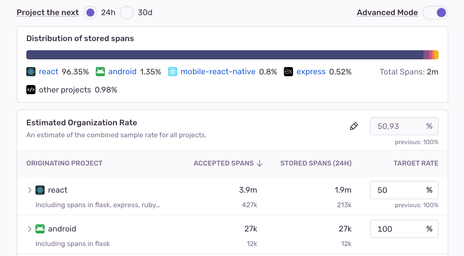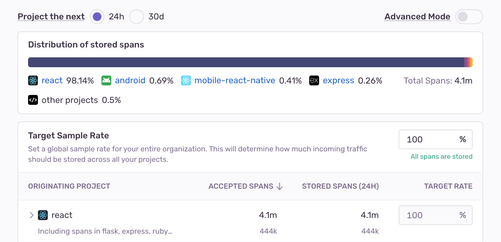 If you want more fine-grained control, you can customize data retention by setting individual sample rates for specific projects by enabling the advanced mode.