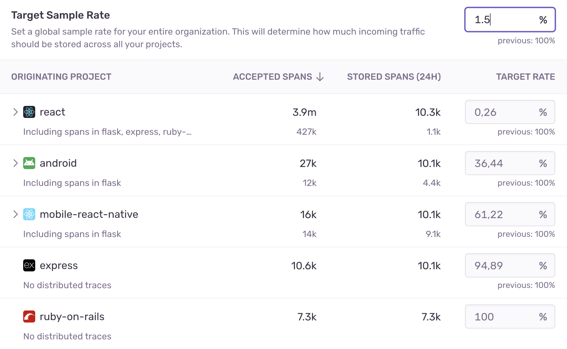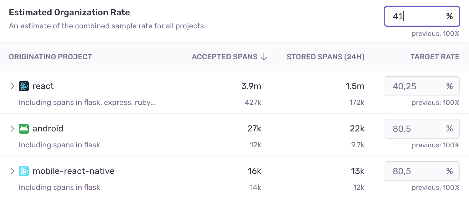 When you edit the sample rates for individual projects, an estimated overall sample rate for your organization will also be calculated. This is a weighted average based on the volume of traffic for each project. Keep in mind that this value is an estimate and may change as the volume of traffic fluctuates.