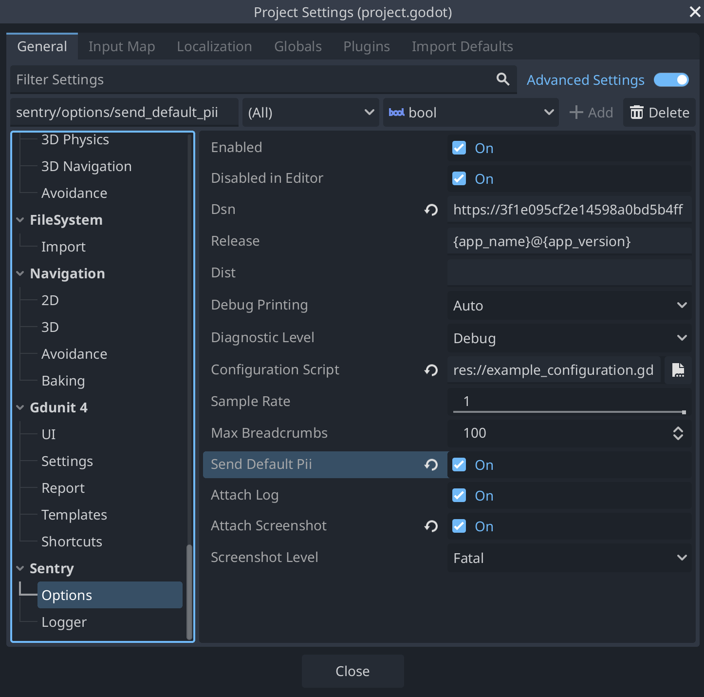 Sentry can be configured via Project Settings or in GDScript. To access project settings in Godot Engine, navigate to Project