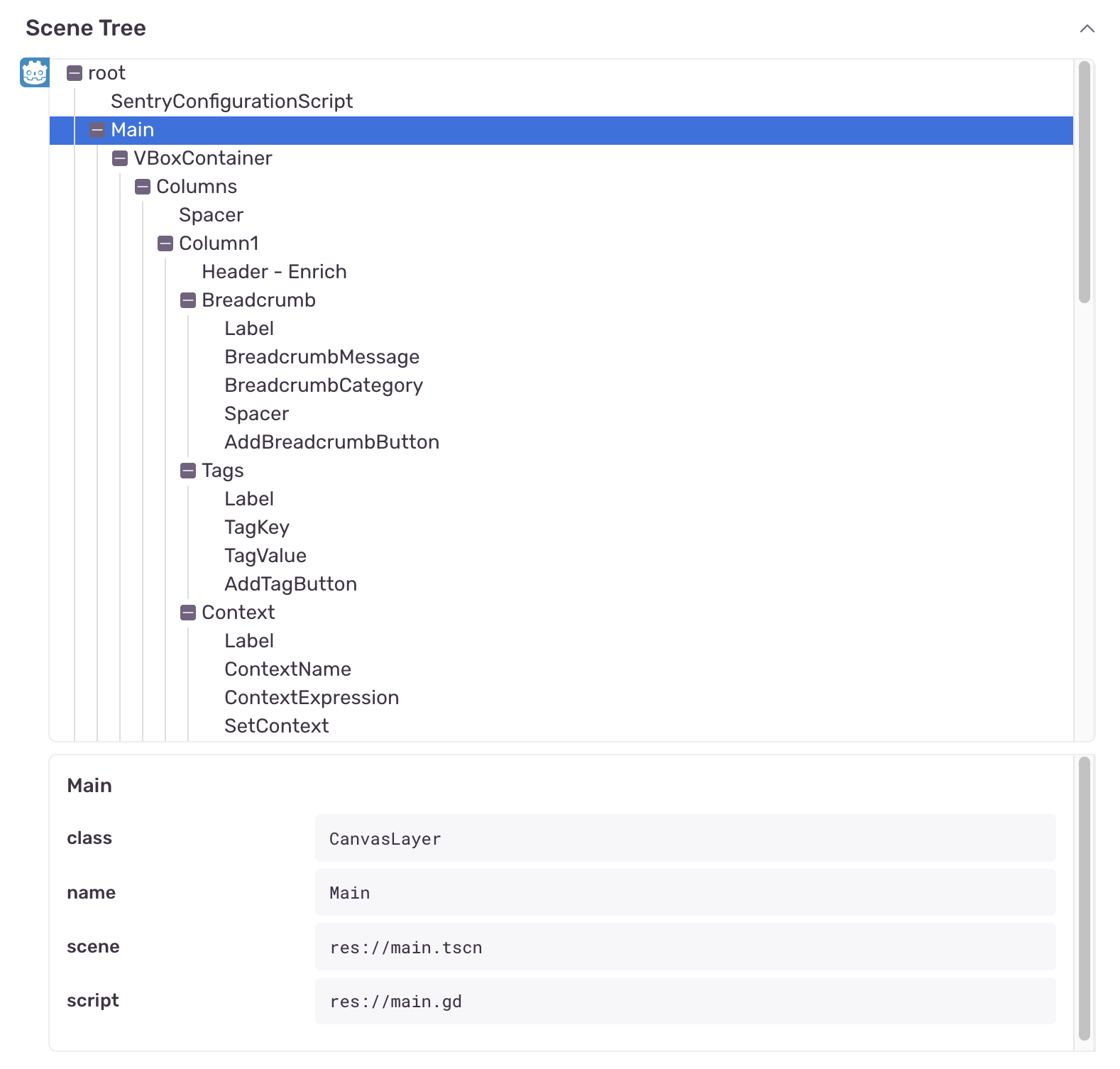 Learn more about capturing scene tree data during errors and crashes. Sentry provides a visual representation of your game's scene tree at the time of failure, giving you additional insight into issues.