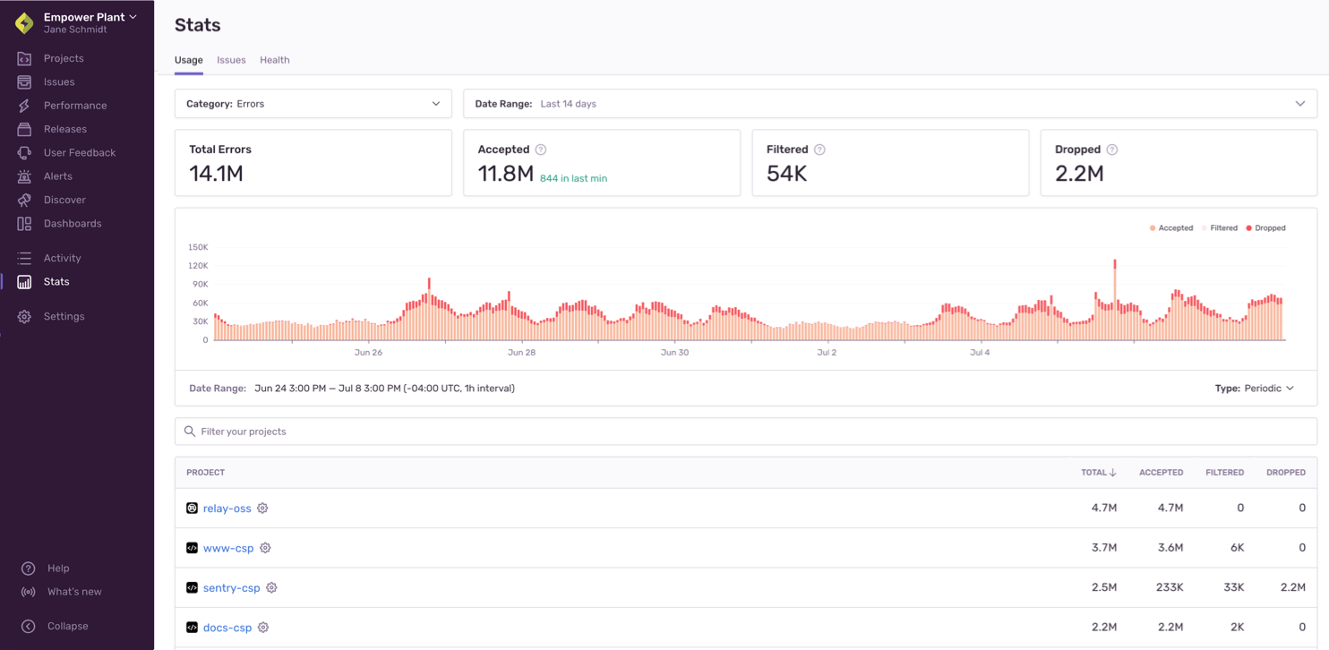 • Quota - Your quota is the amount of data (errors, spans, replays, attachments) that you pay Sentry to track.