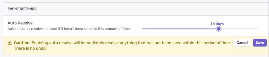• To manage stale issues within Sentry, enable auto-resolve for those unseen within a set timeframe. We recommend setting auto-resolve to 2 weeks for optimal issue and regression tracking. Configure this in Project Settings > General Settings > Auto Resolve.